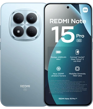 Beide Smartphones setzen auf Glas und Aluminium. Das Redmi Note 15 Pro wirkt mit seiner matten Rückseite edel und liegt mit seinen Maßen von 163,61 x 78,09 x 7,78 mm gut in der Hand. Corning® Gorilla® Glass Victus® 2 und IP68-Zertifizierung sorgen für einen sehr guten Schutz bei Stürzen sowie gegen Staub und Wasser. Das Modell ist in den Farben Glacier Blue, Schwarz und Titanium verfügbar.